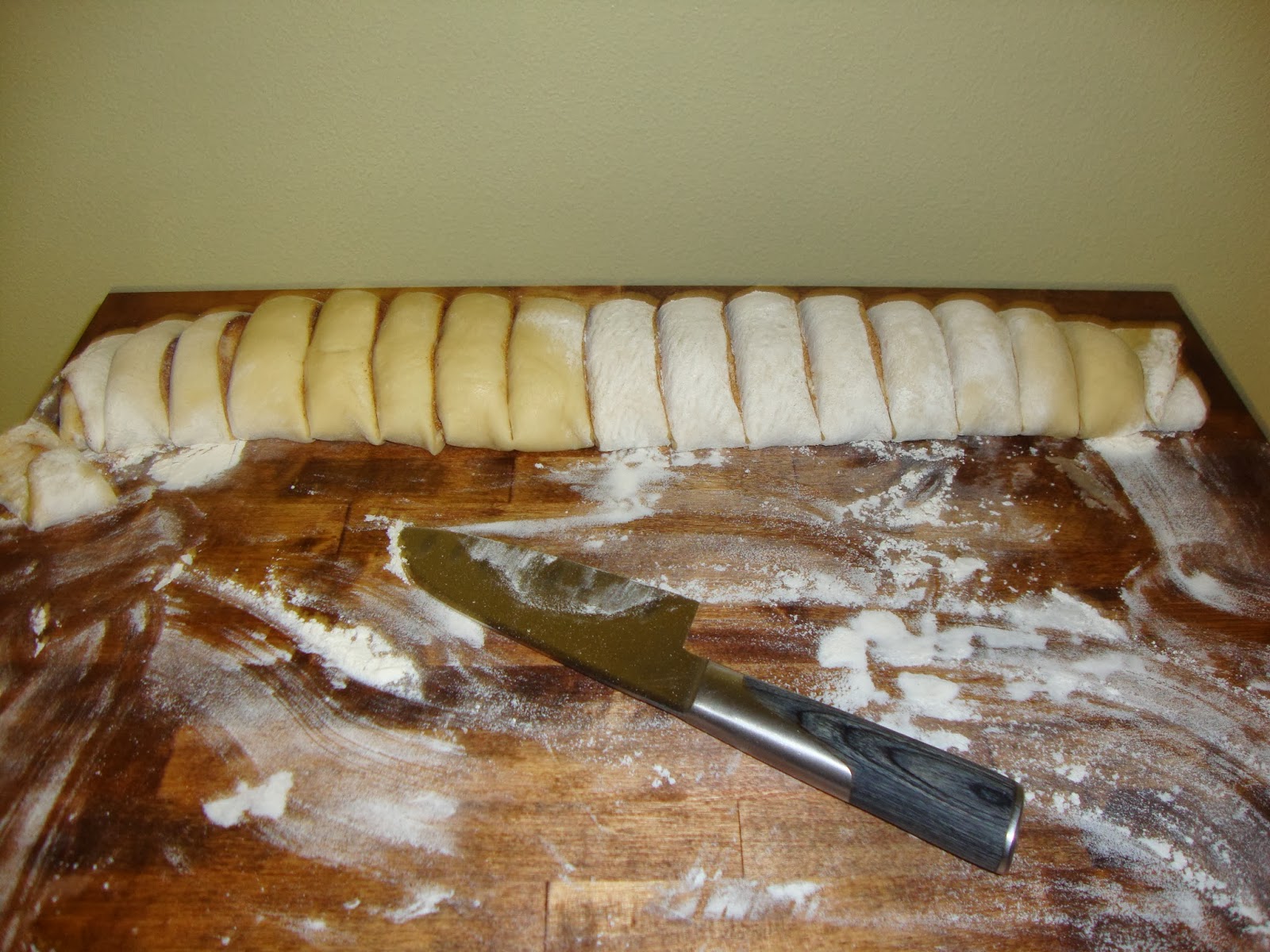 Roll the dough beginning at the 15 inch side and keep the log tight. Cut into 1 inch sections.